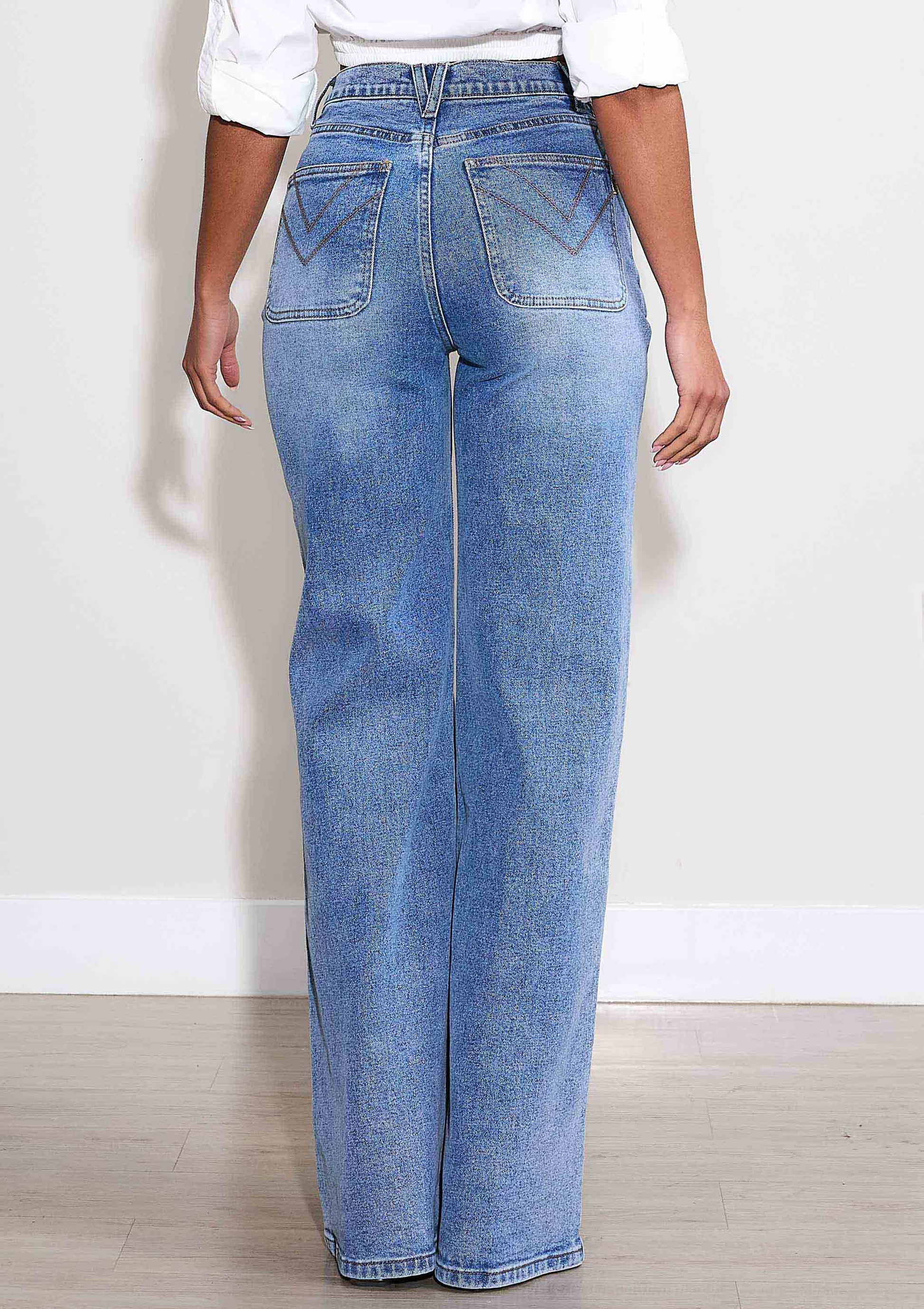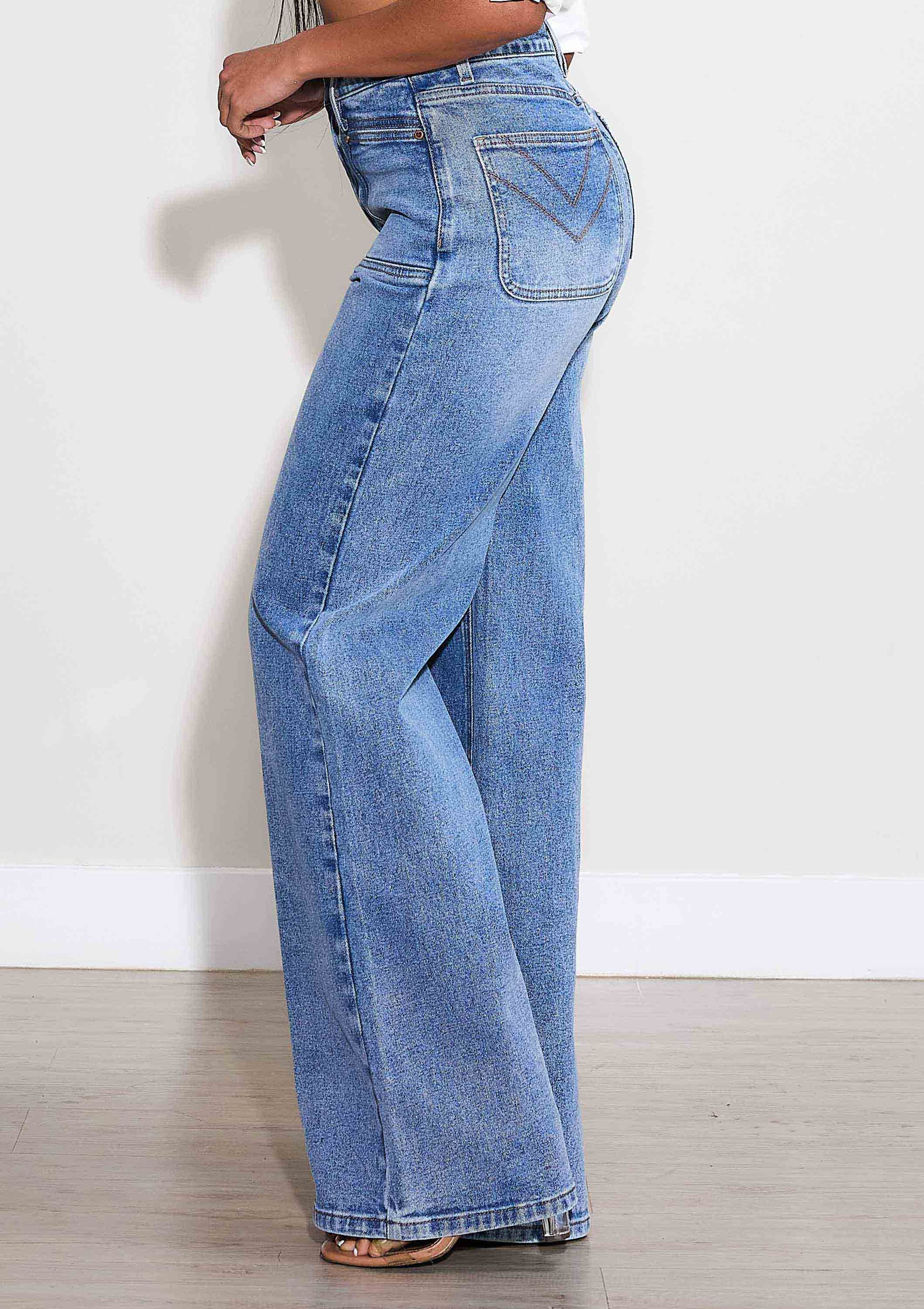 A pair of wide leg jeans featuring front square pockets, back pockets and a zip-fly closure.
